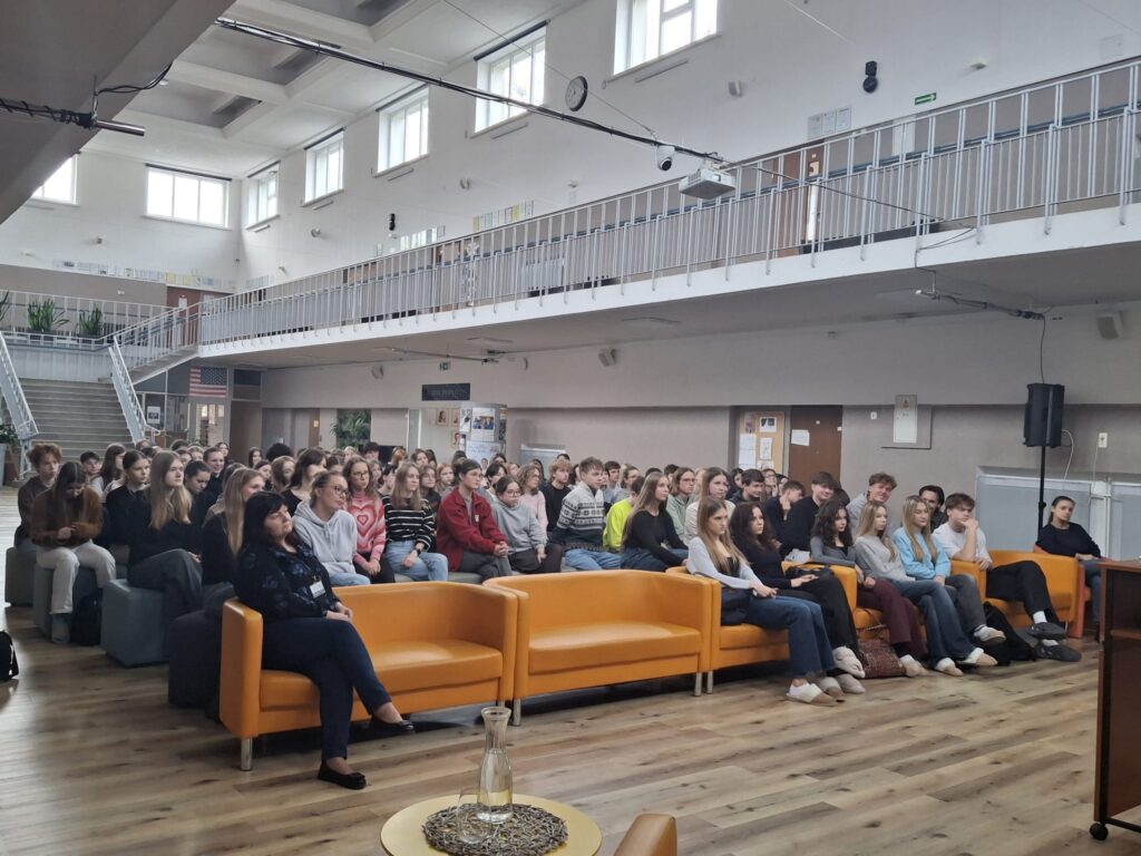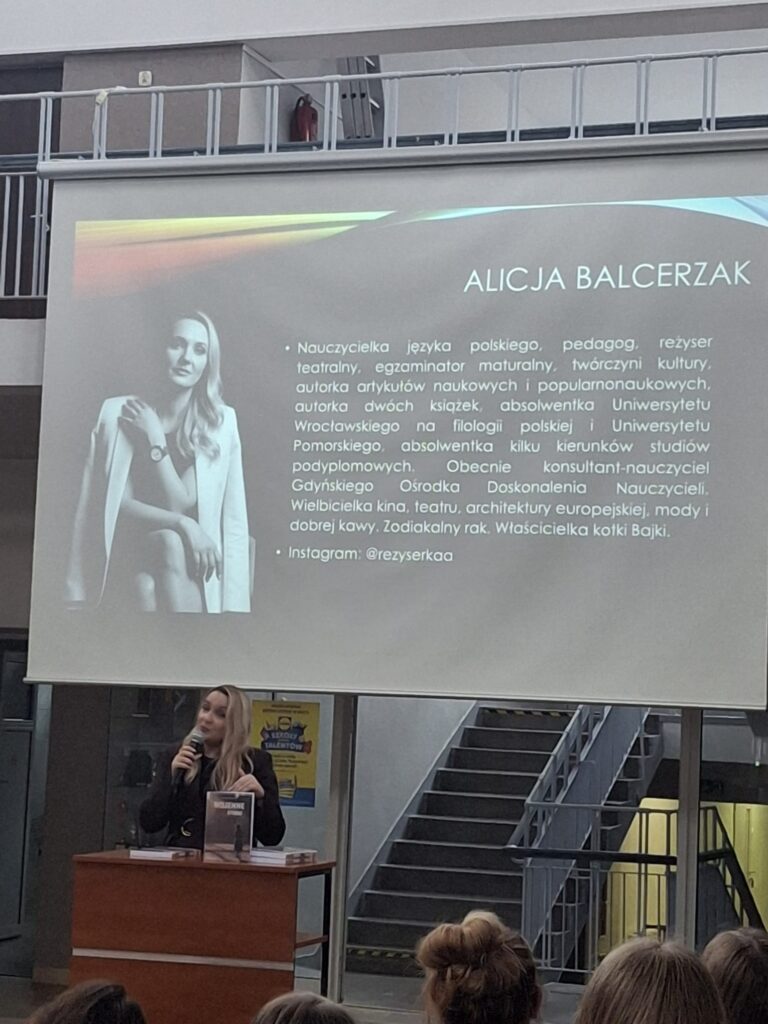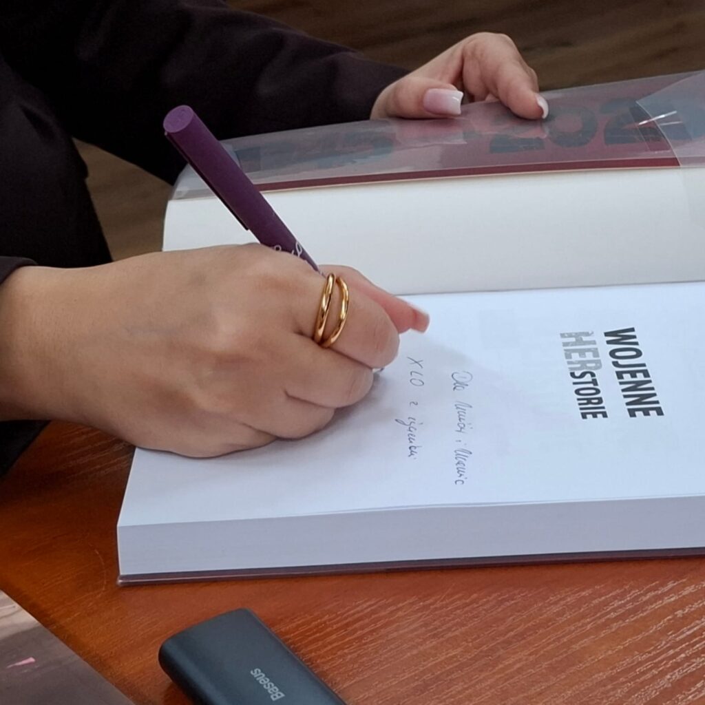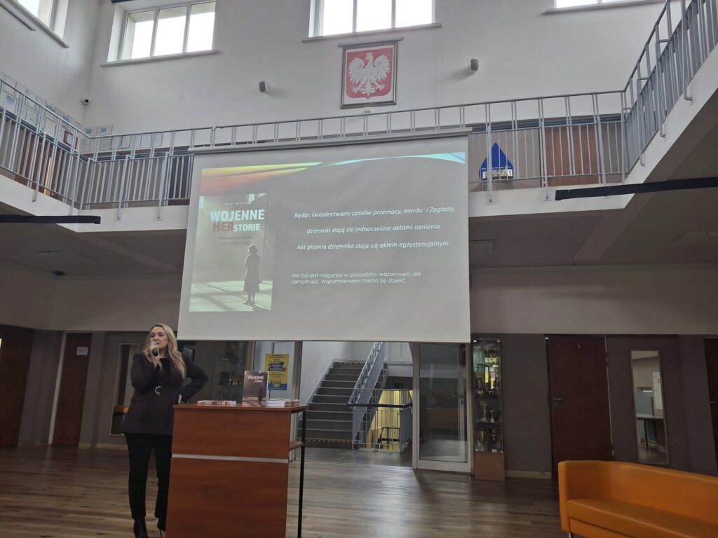 Dnia 12.11 na godzinie wychowawczej uczniowie klas humanistycznych uczestniczyli w spotkaniu z panią Alicją Balcerzak, autorką wyjątkowej książki pt. „Wojenne HERstorie. Wspomnienia kobiet z lat 1939-45.” Poprzednia książka „Niewymazane z pamięci” otrzymała II nagrodę w kategorii najlepszej książki historycznej w konkursie „Ocalić znaczenie wczoraj, uratować dzisiaj” – Funduszu Patriotycznego Instytutu Dziedzictwa Myśli Narodowej im. Romana Dmowskiego i Ignacego Jana Paderewskiego w 2022 roku. Podczas spotkania autorka opowiedziała nam o motywacji powstania książki oraz w jaki sposób dotarła do wspomnień kobiet żyjących w czasie dramatycznych czasów wojennych. W swojej książce pani Alicja Balcerzak „odnosi się do wybranych przykładów kobiet, które odważyły się spisywać swe wojenne przeżycia lub wróciły do nich po latach, przepracowując traumę ‒ swoją i bliskich”. Dzięki spotkaniu poznaliśmy niezwykłe kobiety, których życie było naznaczone tragedią II wojny światowej.