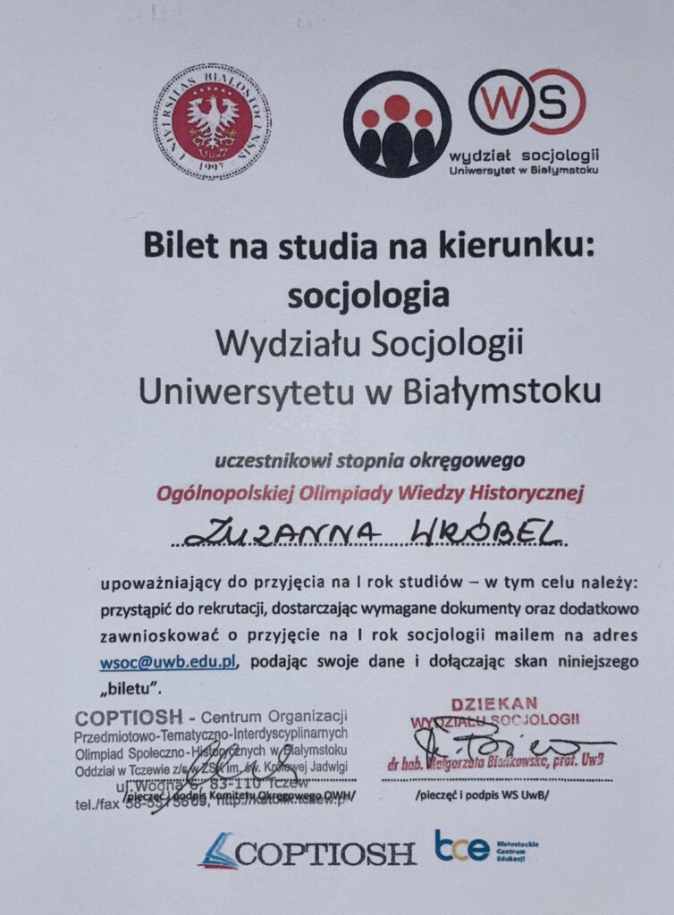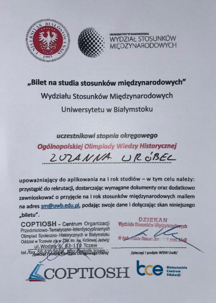 Uzyskany przez Zuzię wynik zaowocował otrzymaniem biletów na I rok studiów na dwóch kierunkach: Socjologia oraz Stosunki Międzynarodowe na Uniwersytecie w Białymstoku. Serdecznie gratulujemy!